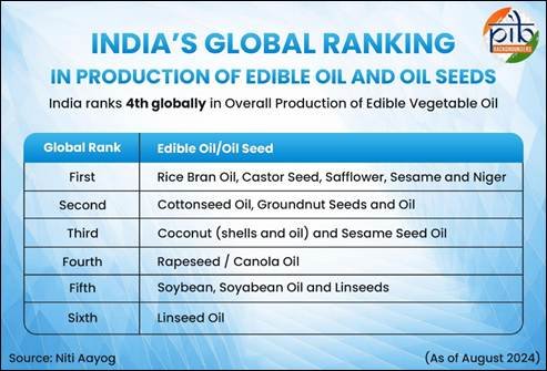 नई दिल्ली | एक नीति आयोग रिपोर्ट ने सोमवार को कहा कि चावल की भूसी के तेल, अरंडी के बीज, कुसुम, तिल और निगर के उत्पादन में भारत वैश्विक स्तर पर प्रथम स्थान पर है।