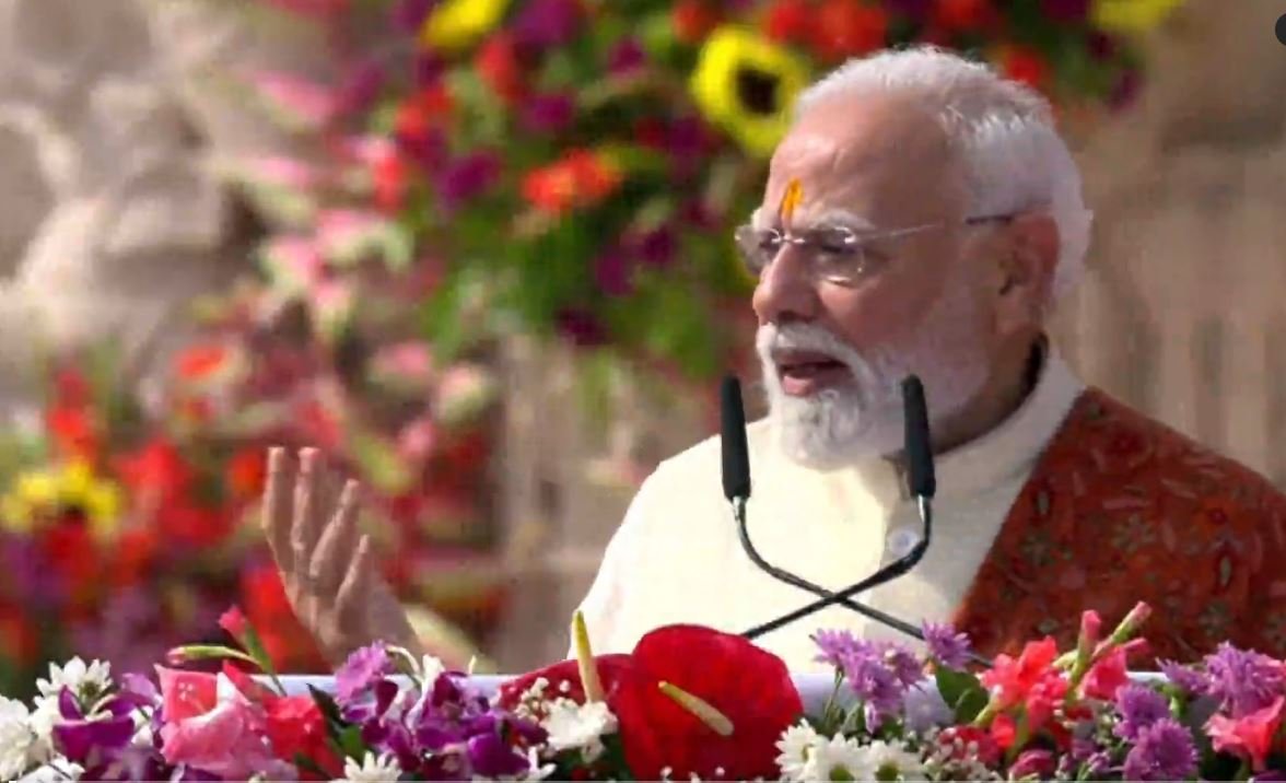 मोदी ने पवित्र श्रीराम जन्मभूमि मंदिर के शिखर पर केसरिया ध्वज को विधिवत फहराया।